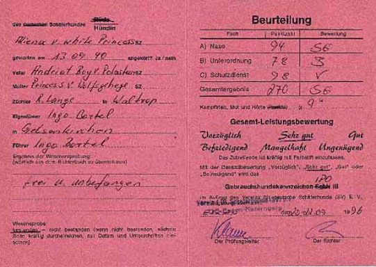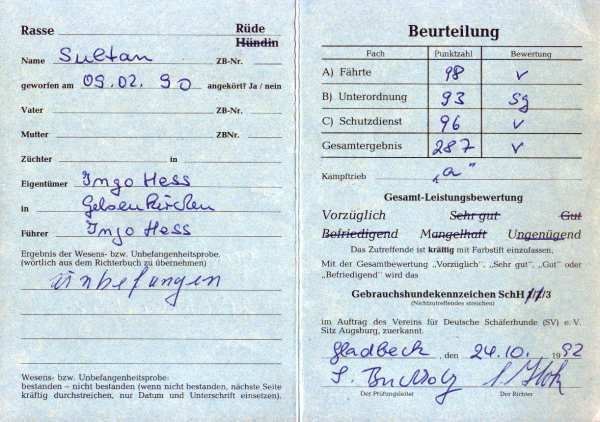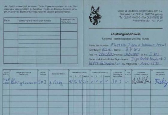 Wurftag: 26.08.1999,HD A,ZB.-Nr.: VR 17301,Chip.-Nr.: 528140001056628, Zuchtbewertung: Vorzüglich