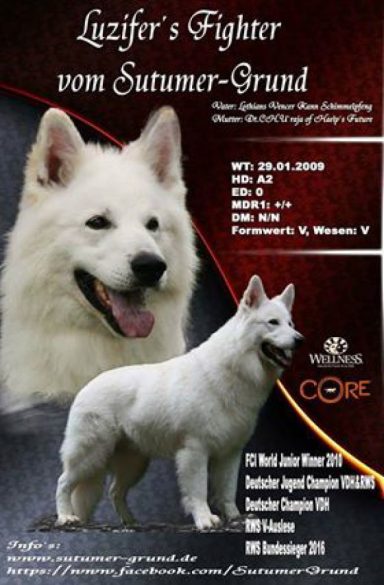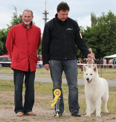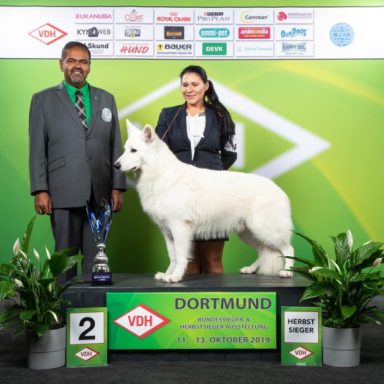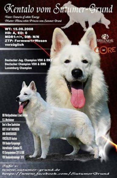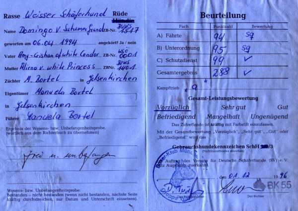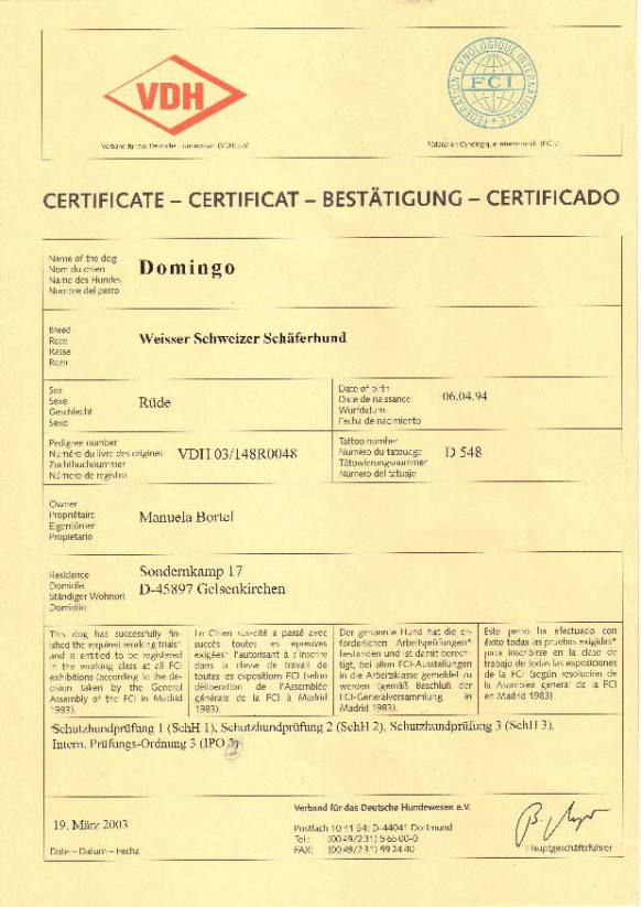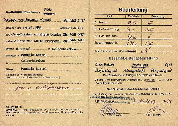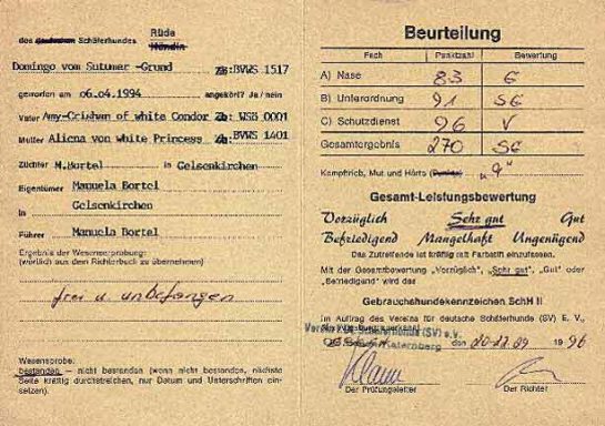 Eltern: Domingo vom Sutumer Grund, SchH 3 und der ersten weißen V – Auslesehündin Ashley vom Sutumer Grund, SchH 3, IPO 1.