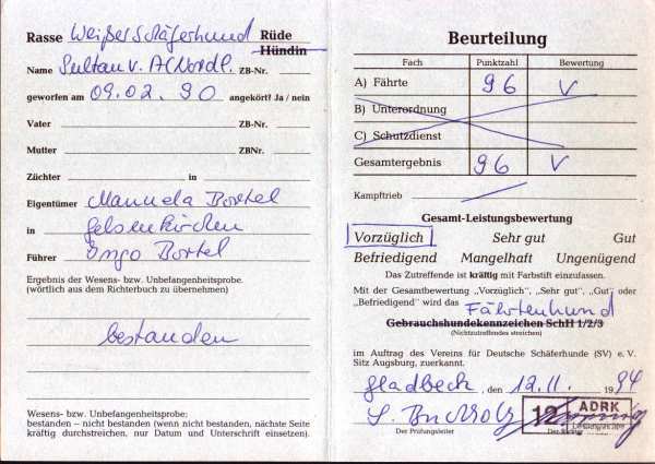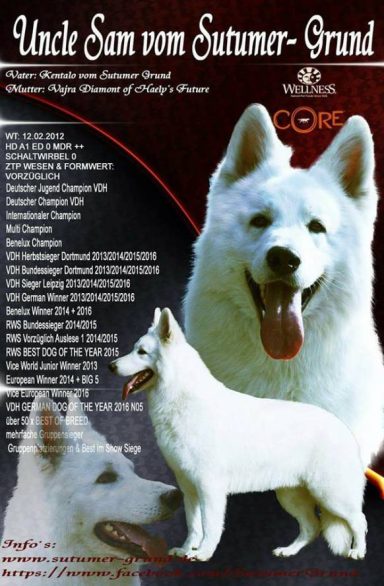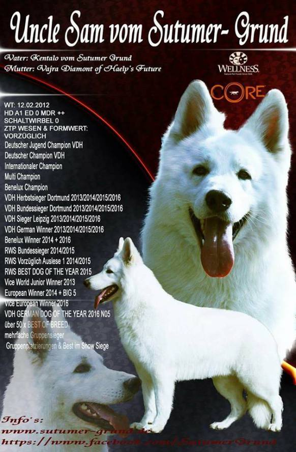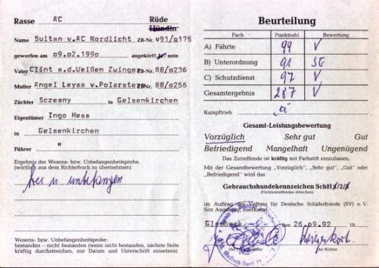 Auch er wurde ( noch unter dem Europ. Dachverband " EDVWS – Europa" mit vorzüglich Auslese prämiert und kann auf zahlreiche hoch bewertete Nachkommen mit Prüfungen im In und Ausland zurückblicken. Einige der bekanntesten Tiere sind Bonita - Candy vom Sutumer Grund SchH 1, Bionda of the white Skorpions SchH 3, Fame Borina of white Condor SchH 1, FH, Finess Ambra of white Condor SchH 1, FH,( ÖKV – Staatsmeisterin ), Andro vom Rittergut SchH 3, IPO 3, FH, Zolltan – Ari vom Wolfsblut SchH 2, sowie der wiederum bekannte österreichische Leistungsdeckrüde Flash – Yukon of white Condor SchH 3, FH, ( OÖ Vizelandesmeister, Sieger des ÖGV Österreich – Cup ). Sultan`s Vererbungskraft waren keine Zufallsprodukte, denn auch seine Enkel und Urenkel können auf Leistungsprüfungen zurückblicken z.B. Apoll from white Arrow SchH1, oder der überdurchschnittlich vererbende Leistungsrüde Einstein – Tyson vom Sutumer – Grund SchH 3, IPO 3 um nur einige zu erwähnen.