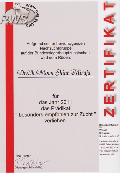 vom RWS 2008 & 2009 besonders empfohlen zur Zucht
