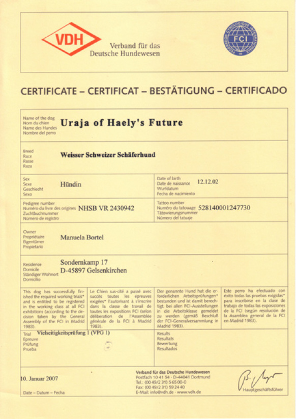 Seit dem 23.06.2003 uneingeschränkt VDH Zuchtzugelassen.